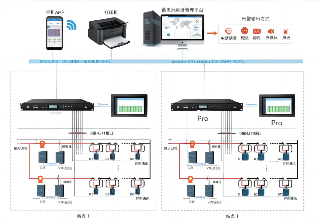 蓄电池监控系统由CH-800-M/CH-800-M-Pro、单体采集器模块、电流霍尔传感器、电压测量模块、电流测量模块、等部分组成。